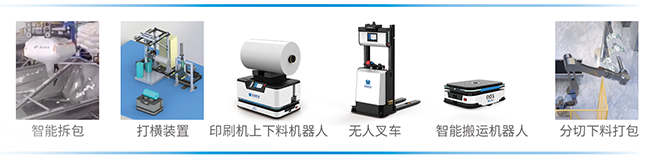 針對以上痛點,藍芯科技以智能拆包裝置、打橫裝置、上下料機器人、無人叉車、搬運機器人、分切下料打包自動線為主體,結合智能倉儲設備、信息化管理系統,實現包裝企業來料自動拆包、物料自主搬運、卷料自動上/下料、庫位自動識別、成品/半成品/原料自動出入庫作業。
