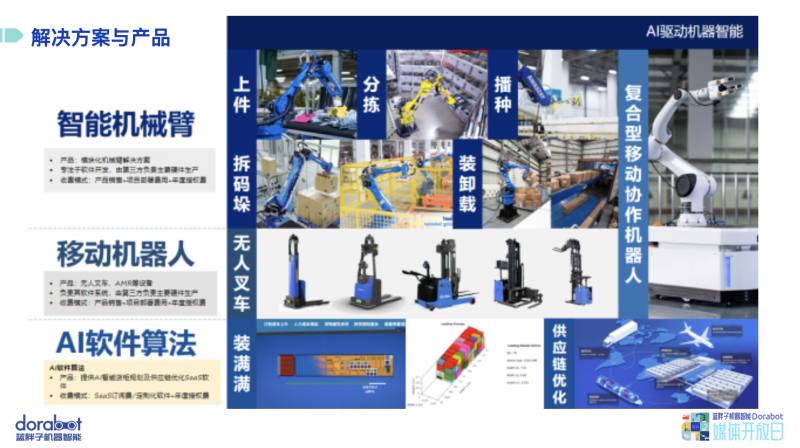 藍(lán)胖子產(chǎn)品主要包括軟硬件相結(jié)合的上件機(jī)器人、分揀機(jī)器人、無(wú)人叉車、拆碼垛機(jī)器人、裝卸載機(jī)器人等,并積累了多種規(guī)劃及優(yōu)化算法,包括智能裝箱算法、智能調(diào)度算法以及多機(jī)規(guī)劃算法。