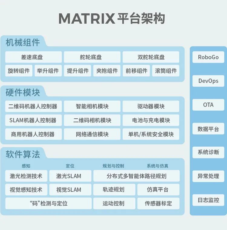 MATRIX,譯作“矩陣”,常見于應用數學、計算機、物理等學科,是機器人的AI核心技術支撐。如果把極智嘉機器人產品比作枝葉和果實,那么MATRIX平臺就如同樹干,就是極智嘉全產品矩陣的發展根基。