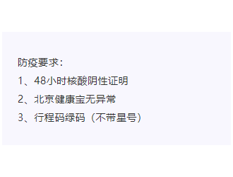 1、48小時核酸陰性證明;2、北京健康寶無異常;3、行程碼綠碼(不帶星號)