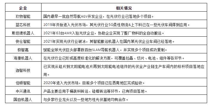 圖表:2021年光伏行業(yè)新增AGV/AMR類型分布整體來看,當(dāng)前光伏行業(yè)的AGV/AMR應(yīng)用還處于前期的階段,整體需求還未完全釋放,競爭相對較低,但伴隨著光伏行業(yè)近兩年投資擴(kuò)產(chǎn)風(fēng)潮的盛行,以及光伏企業(yè)對AGV/AMR產(chǎn)品認(rèn)知度的不斷提高,光伏行業(yè)對AGV/AMR需求也在逐步放量。當(dāng)前,光伏行業(yè)已經(jīng)成為AGV/AMR企業(yè)重點(diǎn)布局領(lǐng)域之一。由于光伏行業(yè)對AGV/AMR的需求以自然導(dǎo)航類為主,當(dāng)前,聚焦光伏行業(yè)的AGV/AMR企業(yè)也大部分以專注于自然導(dǎo)航(SLAM)類產(chǎn)品的企業(yè)為主,如藍(lán)芯科技、斯坦德、快倉智能、極智嘉、海康機(jī)器人、迦智科技、佳順智能、中興通訊、玖物互通等。這些企業(yè)依托自然導(dǎo)航核心技術(shù),結(jié)合光伏行業(yè)需求特點(diǎn),也相繼形成了光伏行業(yè)解決方案。