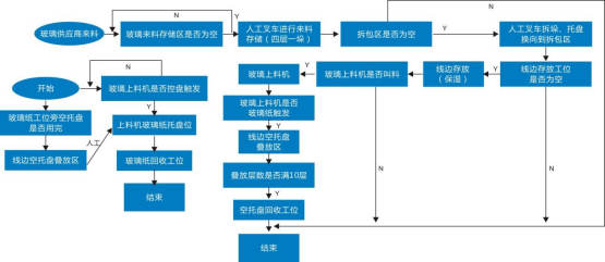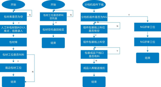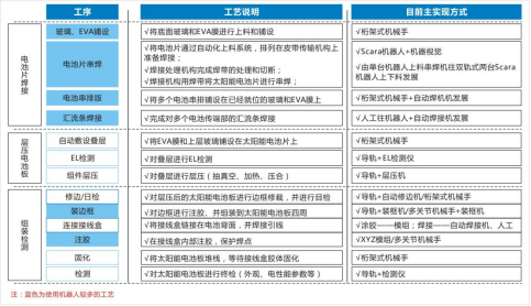 圖表:光伏行業(yè)關(guān)節(jié)機(jī)器人應(yīng)用現(xiàn)狀關(guān)節(jié)機(jī)器人主要運(yùn)用在了電池片焊接、排版、裝邊框、注膠等環(huán)節(jié),而移動(dòng)機(jī)器人主要用于不同工序之間的工序?qū)印?/span>在光伏行業(yè)生產(chǎn)線上,從上游到下游需要用到多種不同類型的AGV。一般會(huì)用到叉車AGV對冶金級別的硅礦(若原料為太陽能級多晶硅材料,則采用潛伏頂升式AGV)等原材料進(jìn)行運(yùn)輸,將原料送上產(chǎn)線進(jìn)行裝料,在高純度石英干過中按層次裝入塊料、粉料、顆粒料、摻雜劑然后放入石墨坩堝合爐,再進(jìn)行抽空檢漏→壓力化→化料→引晶→縮頸→放肩→轉(zhuǎn)肩→等徑生長→收尾、停爐的步驟。電池生產(chǎn)工藝環(huán)節(jié)空間適中,標(biāo)準(zhǔn)化程度高,規(guī)模較大。在傳統(tǒng)生產(chǎn)模式中有大量的工藝對接及半成品上下料搬運(yùn)對接由人工完成,在人員、流程管理、同步時(shí)效性上對用戶有一定困難及挑戰(zhàn):①生產(chǎn)現(xiàn)場要求24小時(shí)連續(xù)作業(yè),作業(yè)人員3班輪替,勞動(dòng)強(qiáng)度大,導(dǎo)致人員流動(dòng)性較大,企業(yè)管理成本劇增;②人工在生產(chǎn)設(shè)備前上料時(shí),雙手只能同時(shí)操作單個(gè)電池片載具依次上料,效率低下;③生產(chǎn)工藝復(fù)雜,對物料上料時(shí)的擺放、朝向、整齊度都有嚴(yán)格要求,要求作業(yè)人員低容錯(cuò)率和規(guī)范化作業(yè),如在太陽能電池片生產(chǎn)過程中,有一道工序是將硅片插入花籃中,并將插滿硅片的花籃運(yùn)輸至其它工藝設(shè)備處,以進(jìn)行后續(xù)生產(chǎn)作業(yè)。為了將硅片準(zhǔn)確地插入花籃中,一般通過工作人員人工操作,一片一片地將硅片插入花籃中。此外,將插滿硅片的花籃運(yùn)輸至其它工藝設(shè)備處也是通過工作人員人工搬運(yùn)實(shí)現(xiàn)的。由于硅片本身具有薄、脆等特點(diǎn),因此,相關(guān)技術(shù)在將硅片插入花籃中時(shí),容易因?yàn)楣ぷ魅藛T力道不均而損壞硅片。④不同工藝環(huán)節(jié)之間由人工完成物料的搬運(yùn)與上料,中間環(huán)節(jié)物料信息缺失,異常原因難以追溯。為了解決傳統(tǒng)人工模式存在的種種問題,光伏廠商開始在電池片生產(chǎn)車間引進(jìn)AGV/AMR,實(shí)現(xiàn)從發(fā)料至下線,及生產(chǎn)中制絨、擴(kuò)散、激光、刻蝕、退火氧化、鍍膜、背膜、正膜、絲網(wǎng)印刷等工藝的對接搬運(yùn),實(shí)現(xiàn)硅料、硅片安全高效的自動(dòng)化轉(zhuǎn)運(yùn)。當(dāng)前,在電池片生產(chǎn)流程中,主要應(yīng)用的AGV/AMR車型有兩種,分體式與一體式AGV,分體式AGV是直接頂升貨架,再與自動(dòng)化設(shè)備或者主機(jī)臺工藝設(shè)備進(jìn)行對接,一體式AGV則是上方會(huì)有傳輸帶(如輥道等)配件,可直接作為生產(chǎn)線傳輸帶的一部分。玻璃原片上料—EVA裁切鋪設(shè)—自動(dòng)上模板—自動(dòng)串焊—自動(dòng)擺串—上背玻—EL測試單元—緩存堆棧—混進(jìn)定位單元—層壓機(jī)—混出定位單元—自動(dòng)修邊—翻轉(zhuǎn)檢查單元—自動(dòng)裝框—上料機(jī)—固化—清洗--下料機(jī)—絕緣耐壓測試—IV測試單元—自動(dòng)分檔—自動(dòng)包裝—自動(dòng)出入庫等。組件生產(chǎn)AGV自動(dòng)小車自動(dòng)按需運(yùn)輸流程大致流程如下: