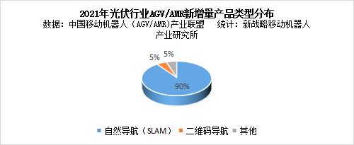 圖表:2021年度工業(yè)移動(dòng)機(jī)器人主要應(yīng)用市場根據(jù)中國移動(dòng)機(jī)器人(AGV/AMR)產(chǎn)業(yè)聯(lián)盟數(shù)據(jù)、新戰(zhàn)略移動(dòng)機(jī)器人產(chǎn)業(yè)研究所統(tǒng)計(jì)顯示,2021年光伏行業(yè)新增AGV/AMR中,自然導(dǎo)航(SLAM)占比超過90%;其次是二維碼導(dǎo)航,占比約為5%;其他約為5%。目前光伏行業(yè)呈現(xiàn)出技術(shù)快速迭代的現(xiàn)狀,柔性化、定制化、快速更新是行業(yè)發(fā)展的趨勢,對設(shè)備的柔性化要求很高,因此,當(dāng)前光伏工廠所應(yīng)用AGV/AMR基本以自然導(dǎo)航(SLAM)產(chǎn)品為主。