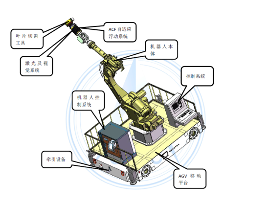 在葉片切割打磨系統的應用案例中,航天智造導入了全向移動AGV載六關節臂式機器人,機器人腕部配ACF自適應浮動系統,激光及視覺引導自動打磨切割,航天定制切割打磨頭,實現60米以上葉片2個小時內完成前后緣處理;風電葉片打磨機器人系統,屬于大型曲面磨拋技術,主要技術點在于恒力控制和AGV協同機器人軌跡規劃技術,一支葉片60米一次打磨率超過80%,完成效率不超過2個小時。