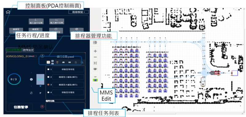 目前,中強光智能對調度系統及智慧倉儲系統已實現完全自主研發,其中包含車輛管理、任務規劃、任務排程、地圖管理等子功能,在應用中系統可自動依照操作任務對AMR進行派遣及路徑規劃,同時管理車隊調度、分析每日進出貨及車輛運行狀態等,具體如下: