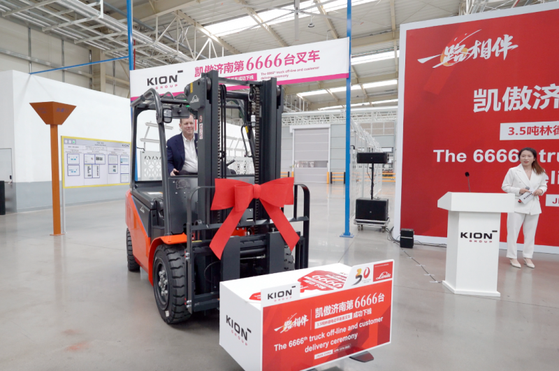 2023年4月13日,一路相伴暨凱傲濟南工廠第6666臺林德3.5噸電動平衡重叉車下線儀式在濟南萊蕪智慧工廠盛大舉行。凱傲集團首席執行官Rob Smith、凱傲集團董事兼凱傲亞太及美洲區總裁郭進鵬凱傲集團執行董事會成員及凱傲中國管理層海爾集團客戶方代表、媒體嘉賓等出席本次活動,共同見證這歷史性時刻。