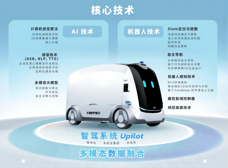 據了解,Chitu赤兔還搭載了UQI優奇自主研發的智能駕駛系統Upilot,并融合計算機視覺算法、語音技術、多模態大模型、SLAM定位與建圖、自主導航、高精度感知等“AI+機器人”技術,達到國內先進的L4級無人駕駛技術水平。