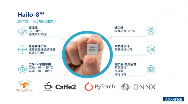 該方案采用Hailo-8高性能芯片,同時(shí)可支持Tensorflow Lite、Caffe、PyTorch、ONNX等多種AI框架,計(jì)算能力高效。