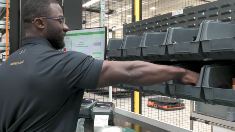 Farsound倉庫投入使用 “貨到人” 解決方案,布置了650個可移動貨架和8個揀選站。同時,設置指示燈和PTL分撥墻引導員工作業,確保揀選、投放準確。該方案釋放了32,000個料箱的額外存儲空間,提升了場地空間利用率。