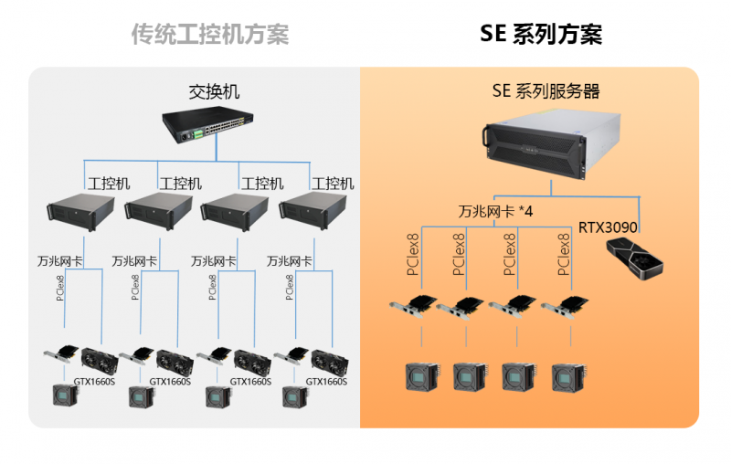 SE系列布置簡單、靈活,調(diào)試更便捷;一臺設(shè)備集多卡擴(kuò)展、高速處理、高速存儲3合1,更省空間;搭配專業(yè)PCIe接口存儲設(shè)備,輕松實(shí)現(xiàn)高速存圖需求。