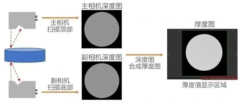 方案優(yōu)勢:通過雙相機(jī)對射拼接掃的方式描圓柱體兩個面,輸出圓柱體“厚度”圖像(兩張深度圖差分形成),在“厚度”圖像中可直接顯示圓柱體任意點(diǎn)位的厚度值,以及兩個平面的3D數(shù)據(jù)