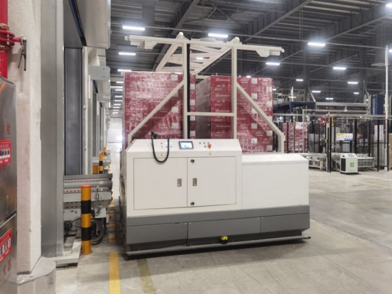 百威項目采用今天國際13臺AGV小車,包括9臺雙工位平衡重叉取式AGV,4臺四工位背輥式全向AGV小車兩種車型。四工位背輥式全向AGV用于成品啤酒下線,完成成品入庫搬運。雙工位平衡重叉取式AGV小車把輸送機站臺的成品搬運到潮汐存放倉庫,采用密集地堆方式存放。在AGV收到備貨指令時,把產品從潮汐倉庫或者立庫出庫成品搬運到備貨區域。實現了生產線上生產出成品啤酒無人化精準搬運入庫,再到從倉庫出貨到備貨區搬運。