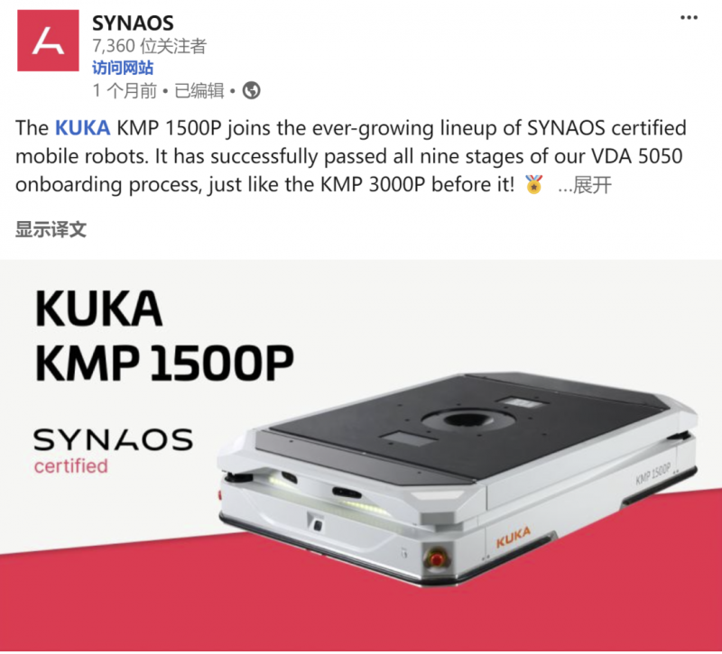 核心提示:庫卡中國聯合美的中央研究院共同開發的第一款AMR全球平臺產品KMP 1500P再次獲得SYNAOS的官方權威認證