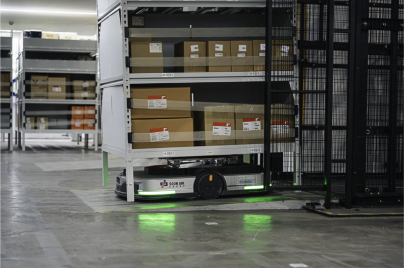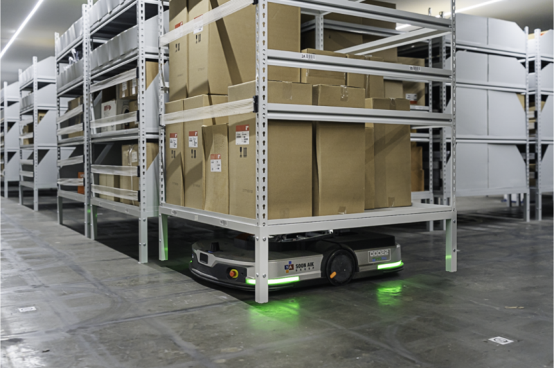 AMR在倉庫三個平臺層間靈活穿梭搬運貨物,充分挖掘了倉庫的垂直空間潛力,實現空間的最大化利用。