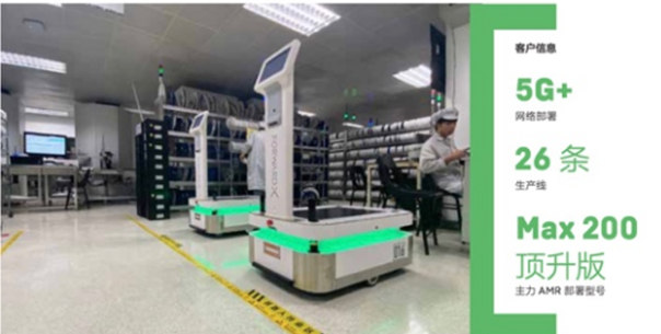 全球領先的某大型通信設備公司無線小基站智能工廠項目,迦智科技近百臺自然導航AMR,在5G技術低延時、高帶寬、高速率的傳輸特性加持下,實現了與用戶現場的MES、WMS以及第三方設備間的互聯互通,信息上傳下達,交互協同作業。