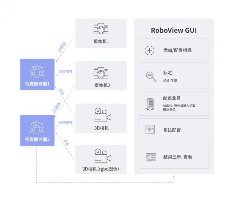 RoboView 視覺 AI 解決方案以先進的機器視覺算法為后臺(RoboView Server),以易于操作和直觀顯示的界面軟件 RoboView GUI 為前端,為客戶提供覆蓋生產(chǎn)、安全、管理等環(huán)節(jié)下的眾多應用的視覺 AI 解決方案。