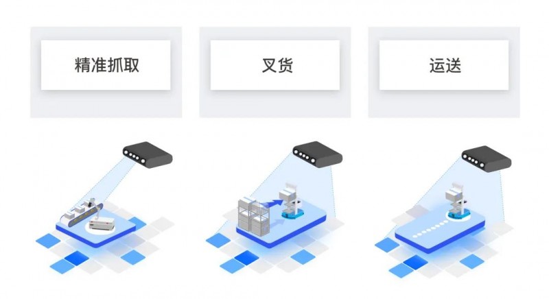 在產(chǎn)線上,RoboView Server 能夠連接多種不同類型的相機,如使用激光相機拍攝視野中任意位置的貨物,對獲取到的 3D 點云,運用點云算法識別、定位算法精確(最高可精度達到0.1mm)的計算出產(chǎn)品的位姿和外形尺寸信息,并發(fā)送給機械臂或 AGV,精準抓取、 裝包或叉貨、運送的任務,或是智能引導涂膠等