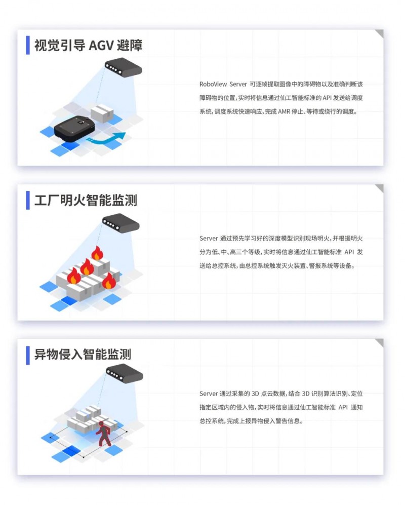 RoboView Server 通過攝像頭實時采集的現(xiàn)場視頻,經(jīng)過不同的視覺算法判斷現(xiàn)場情況,實時 通過仙工智能標準 API 發(fā)送給對應的調(diào)度系統(tǒng)或總控系統(tǒng),以確保工作、生產(chǎn)安全進行。