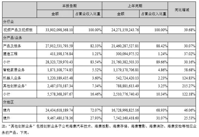 報(bào)告中主要營(yíng)業(yè)收入組成如下,創(chuàng)新業(yè)務(wù)和機(jī)器人業(yè)務(wù)增長(zhǎng)迅速,表現(xiàn)非凡。其中,海康機(jī)器人實(shí)現(xiàn)營(yíng)收12.2億,同比增長(zhǎng)124.83%。