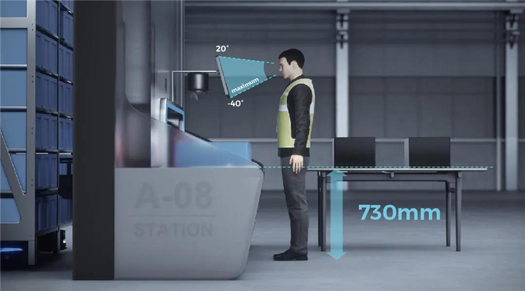 經研究分析,類Kiva系統中揀貨人員共有四大動作,尋找、觸達、校驗和揀選完成后的播種。目前,PopPick將前面三個動作均進行了優化,既避免了尋找商品可能造成的差錯,也極大地減少了時間浪費,最大程度地提高了人效。此外,PopPick工作站符合人體工學設計,揀貨人員不需要彎腰或者攀高,揀貨箱被自動送到手邊,雙點揀選最大化人員的揀貨效率,箱式揀選效率可達650箱/小時/工位。