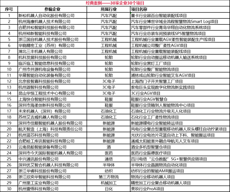 為了更好的宣導和展示從91年國產AGV落地應用以來在各行各業(yè)的經典案例,以及將案例與技術相結合,凸顯行業(yè)前瞻技術的論文集萃。中國移動機器人(AGV/AMR)產業(yè)聯(lián)盟與新戰(zhàn)略移動機器人產業(yè)研究所聯(lián)合出版了《中國工業(yè)應用移動機器人經典案例匯編及技術發(fā)展論文集(2021版)》。具體入選案例名錄如下: