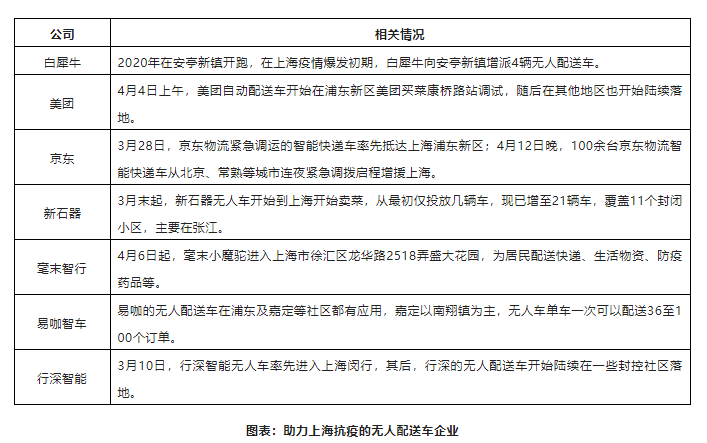 自疫情爆發(fā)后,白犀牛、新石器、易咖智車(chē)、毫末智行、行深智能等多家無(wú)人配送車(chē)企業(yè),第一時(shí)間馳援上海開(kāi)展無(wú)人配送,協(xié)助商超抗疫保供,應(yīng)對(duì)訂單激增、運(yùn)力緊張所帶來(lái)的挑戰(zhàn)。