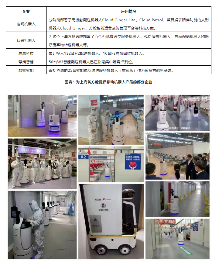 室內(nèi)場(chǎng)景中,主要以方艙醫(yī)院等隔離收治點(diǎn)應(yīng)用為主。本次疫情以來(lái),上海已陸續(xù)啟用一批定點(diǎn)醫(yī)院和方艙醫(yī)院,其中臨港方艙應(yīng)用移動(dòng)機(jī)器人數(shù)量最多。